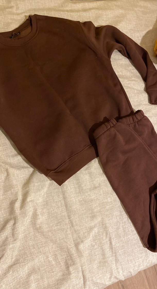 Kadınlar için koyu kahverengi, bol kesim, uzun kollu ve yuvarlak yakalı rahat takım. Yumuşak ve sıcak kumaştan üretilmiş, sade ve normcore tarzıyla zahmetsiz şıklık sunar. Ayrı ayrı da satabilirim