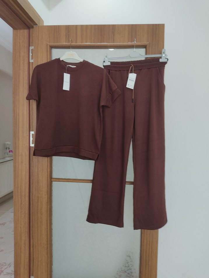 Kadınlar için kahverengi, rahat kesim ve midi boyda eşofman takımı. Yumuşak sentetik kumaştan, yuvarlak yaka ve kısa kollu, gündelik kullanım için uygun, desen içermeyen şık ve rahat stil.