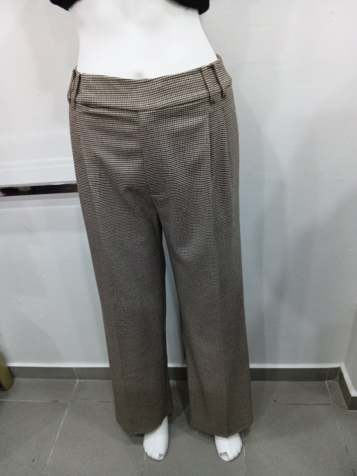 Kadın kahverengi kumaş pantolon, regular fit ve kemer detaylıdır. Midi boyda, desen içermeyen düz dokusu ile ofis kullanımı için uygundur.