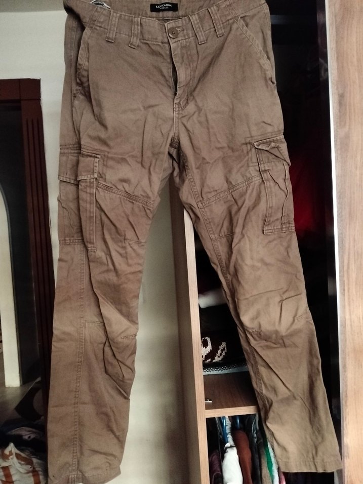 Kemerli, kahverengi, sentetik kumaştan salaş kesim pantolon. Midi boy, sokak modasına uygun, günlük kullanım için ideal.