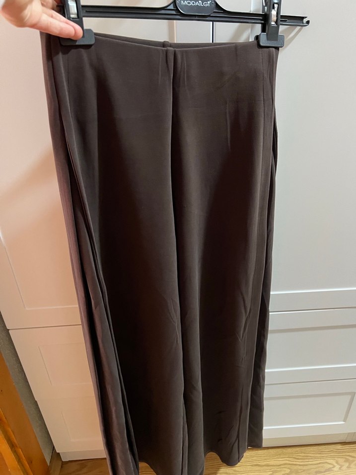 Uzun, salaş kesim kadın pantolonları, kahverengi saten kumaştan drapeli tasarıma sahiptir. Minimalist ve desen içermeyen stiliyle ofis için uygundur.