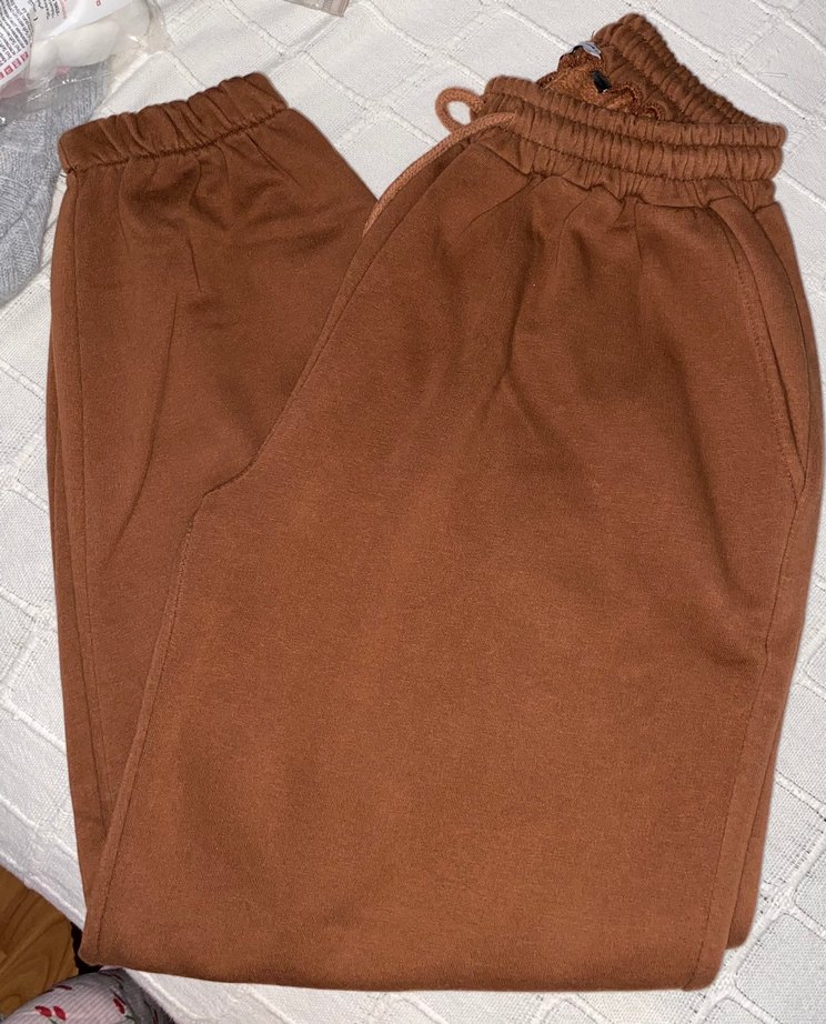 Kadın kahverengi , salaş kesim ve normal midi boyda sweatpant. Günlük rahat kullanıma uygun, zahmetsiz şıklık sunar.