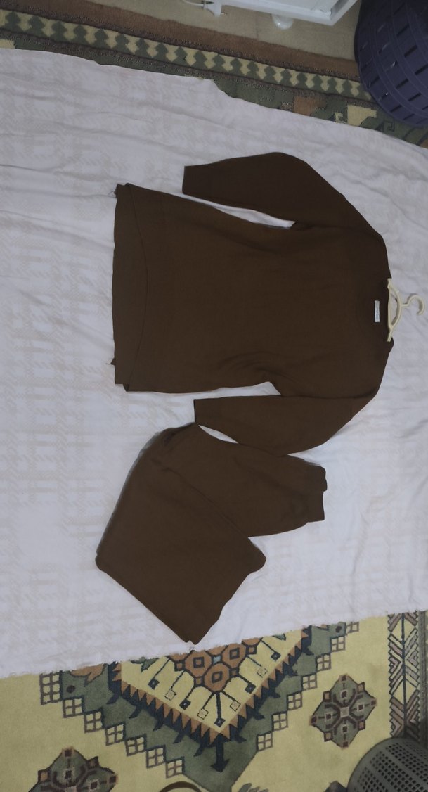 Kadınlar için kahverengi, uzun kollu, salaş kesim ve yumuşak dokulu kumaştan yapılmış günlük kullanıma uygun basic eşofman takımı.