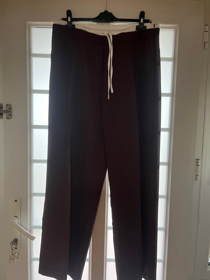 Kadınlar için normal kesim, midi boy, koyu kahverengi saten kumaştan pantolon. Ofis için rahat ve şık, normcore ve athleisure tarzında.Beli 44 cm boyu 103 cm .