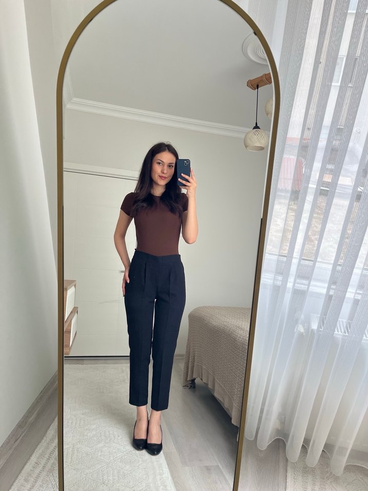 Kadınlar için midi boy, regular fit kahverengi cigarette pantolon, yumuşak ve parlak kumaştan üretilmiştir. İş ortamı için zahmetsiz şıklık sunar.