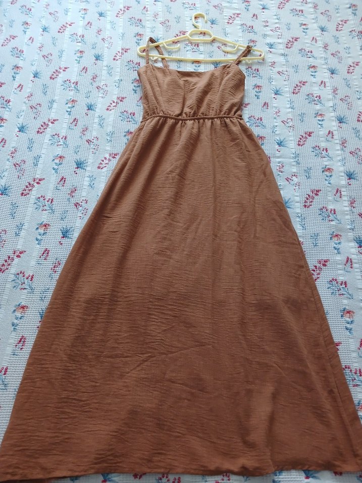 Kahverengi straplez uzun elbise, bol kesim ve drapeli tasarıma sahip, kolsuz ve yumuşak sentetik kumaştan yapılmıştır. Günlük kullanım için bohem tarzına uygundur.