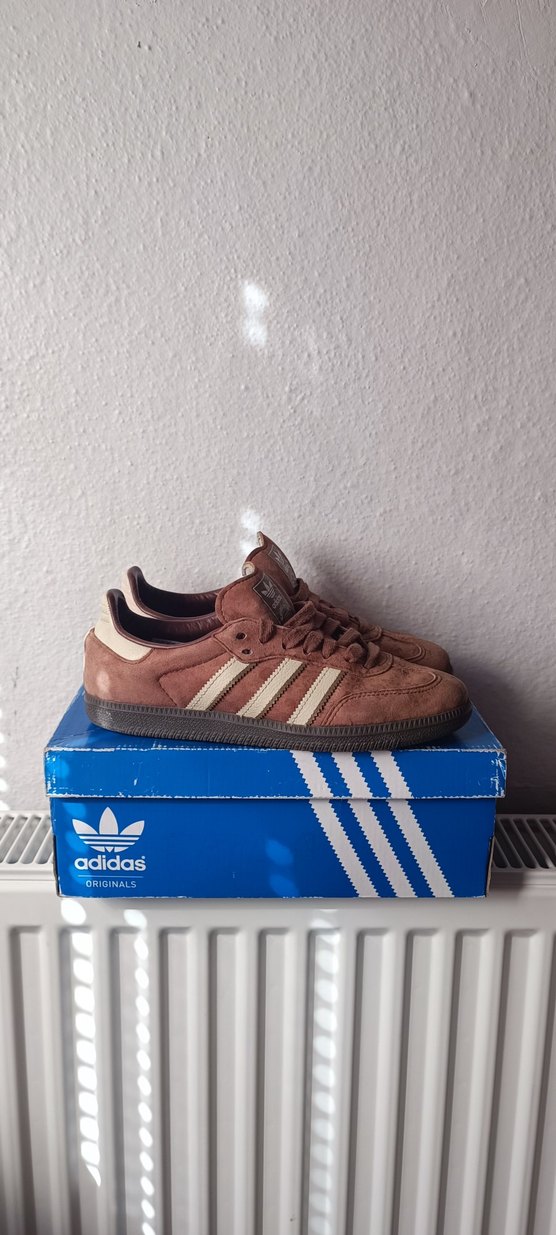 Adidas marka, düz tabanlı, kahverengi süet kadın spor ayakkabısı. Minimal desenli, rahat ve şık bir tasarıma sahiptir. Sadece jhafif su lekeleri var. hasarsizdir. orjinal markadir.