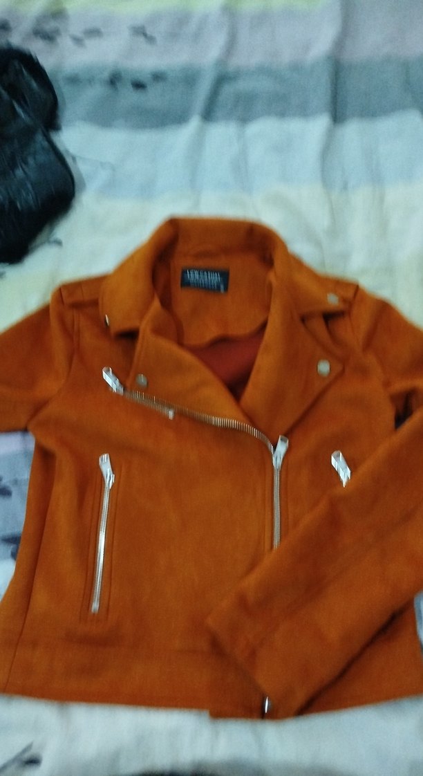 Bu kadın kahverengi süet biker ceket, parlak yüzeyi, kesik yakası ve fermuarlı detaylarıyla dikkat çeker. Kısa boy ve uzun kolludur, sokak stili için uygundur.