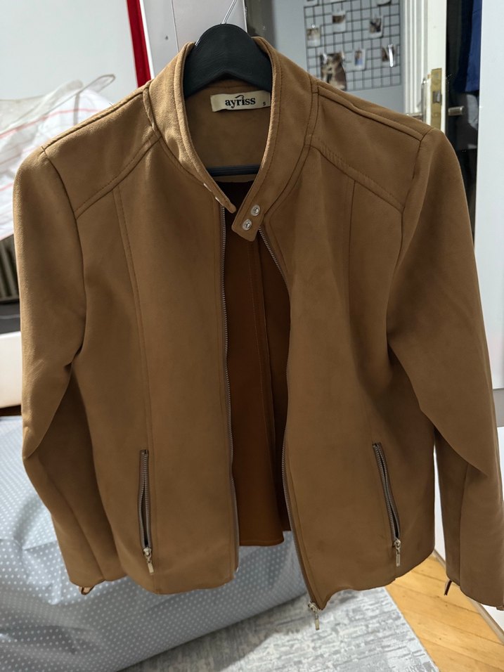 Kadın kahverengi süet ceket, çıtçıtlı yakaya ve düzenli kesime sahiptir. Uzun kollu, fermuarlı cepler ve parlak doku ile günlük kullanıma uygundur. Xs s uyumlu