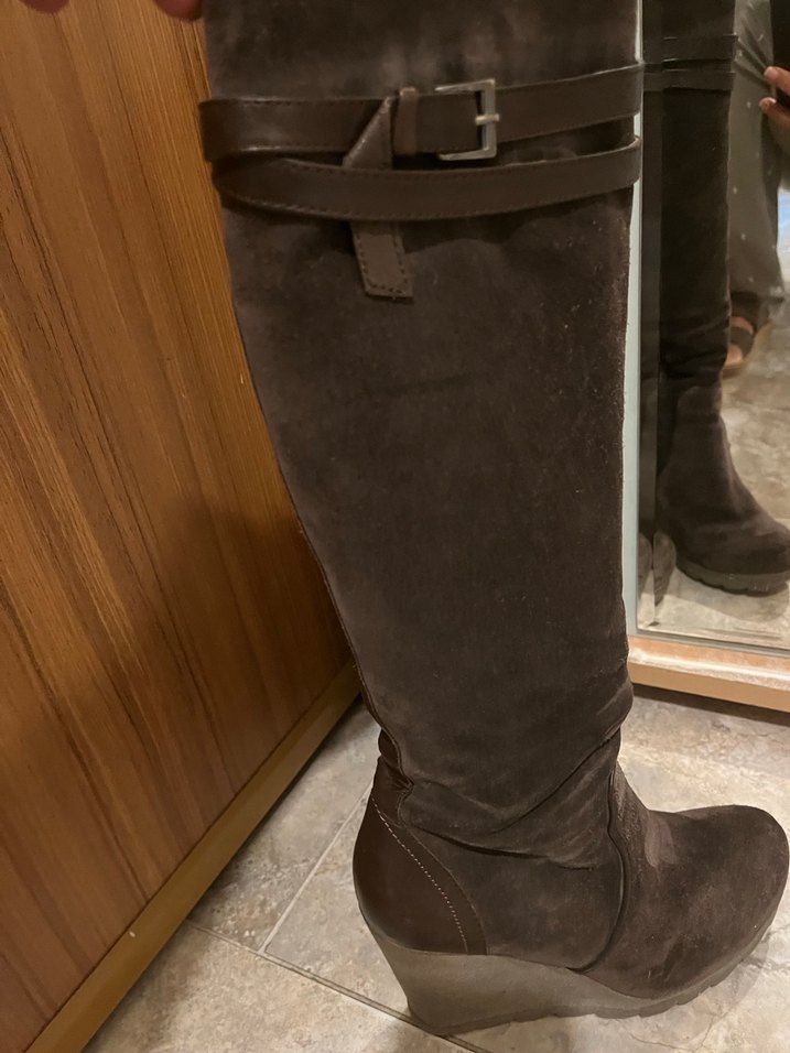Kahverengi süet diz üstü çizme, dolgu topuklu ve tokalı detaylara sahip, günlük kullanıma uygun modern ve rahat tasarım.