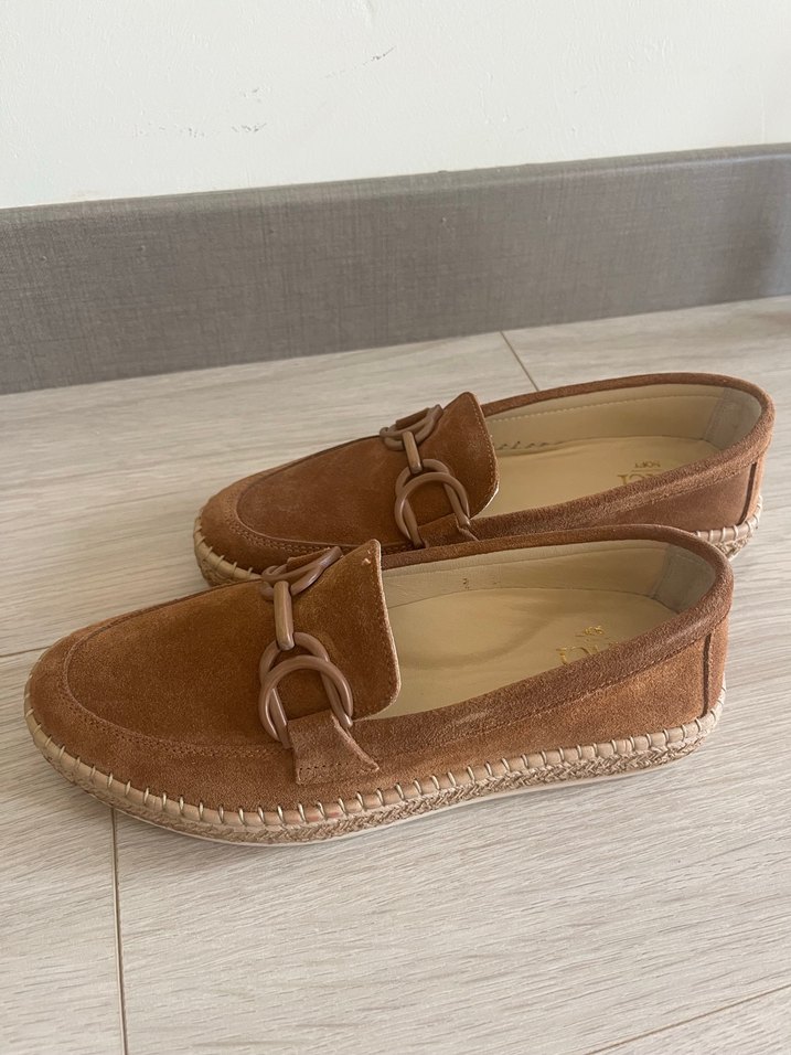 Kahverengi süet kadın espadriller, parlak dokunuşlu, dolgu topuklu ve tokalı detaylı. Günlük kullanım için bohem tarzda rahat ayakkabı.