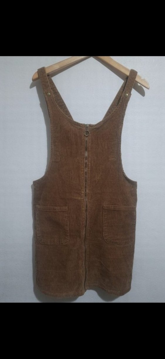 Koyu kahverengi fitilli kadife kumaştan KOTON etiketli 40 beden ön fermuarlı ve iki cepli, kolsuz kısa tulum.SALOPET renk görseldeki gibi