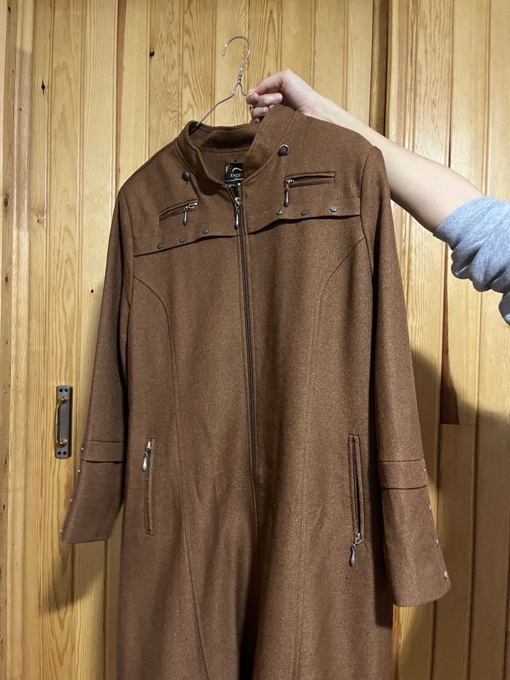Fermuarlı cepleri ve parlak kahverengi süet dokusuyla, uzun kollu, normal boyda, notlu yaka kadın kabanı. Rahat ve şık sokak stili için uygun.