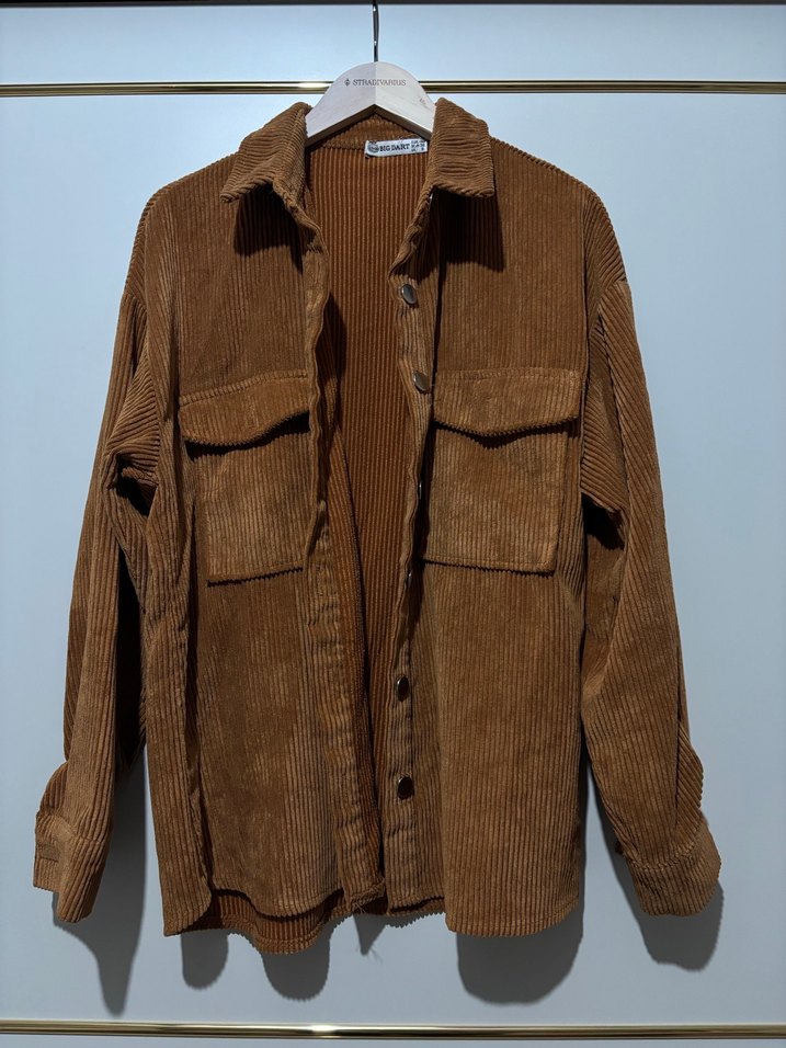 Kadınlar için koyu kahverengi süet gömlek, düğmeli ön ve çıtçıtlı uzun kollu, notalı yaka ve iki göğüs cebi ile rahat kesim. Günlük kullanıma uygundur.
