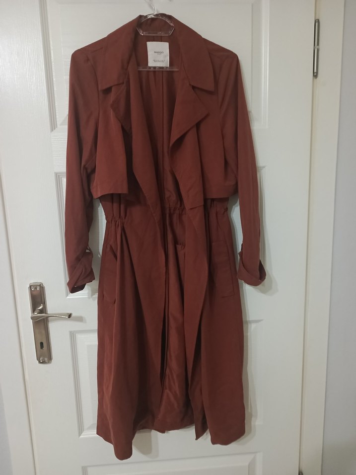 Kadınlar için uzun, kahverengi süet malzemeden yapılmış kemerli ve bol kesim trençkot. Uzun kollu, minimal ve desen içermeyen tasarımı günlük kullanıma uygundur.