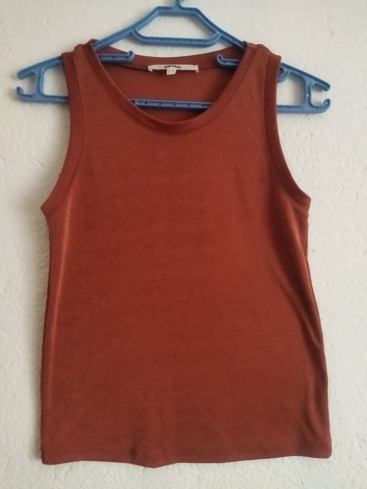 Kahverengi süet kumaştan, kolsuz, yuvarlak yakalı ve vücuda oturan normal boyda kadın atlet. Trendy ve rahat sokak stili için uygundur.