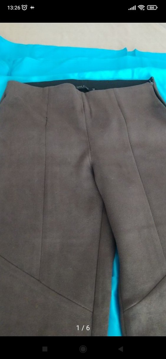 Kahverengi süet kumaştan, normal boy midi pantolon. Düz ve fermuarlı detaylı, ofis kullanımı için uygundur. Sadece fermuarlı bozuktur