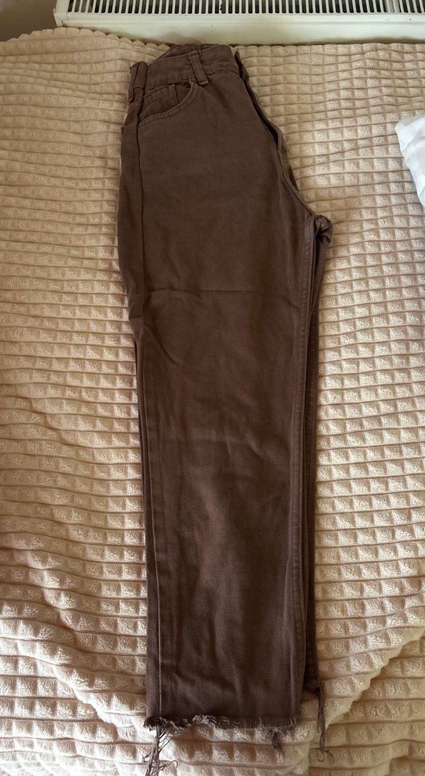 Kahverengi süet kumaştan, normal boy midi uzunlukta, fermuarlı detaylı kadın pantolonu. Düz tasarımıyla günlük rahat kullanıma uygundur.