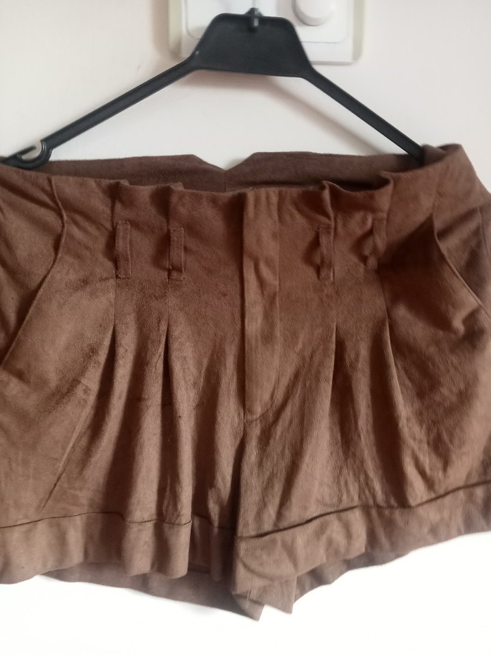 Kahverengi süet kadın şort, pilili tasarım ve bol kesim. Mini uzunlukta, koyu tonlu ve günlük kullanıma uygun bohem tarzda.
