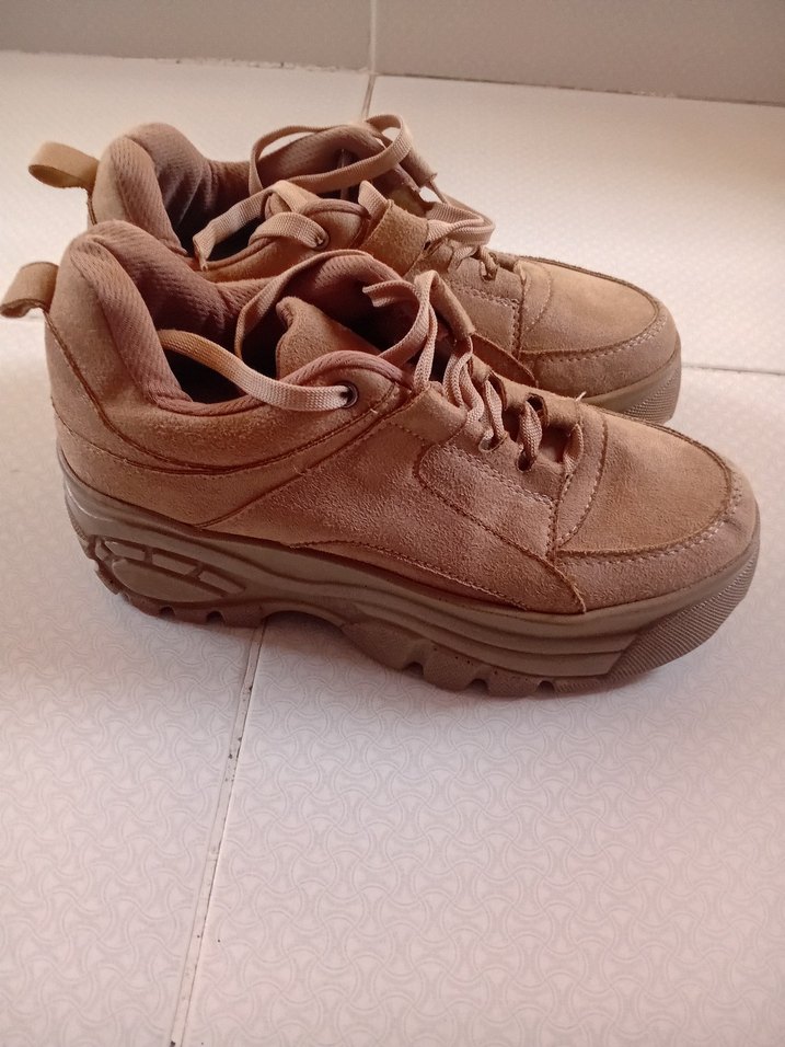Kadınlar için pastel kahverengi süet üst yüzeye sahip, bağcıklı platform topuklu spor ayakkabılar, günlük ve sokak tarzı için uygundur.
