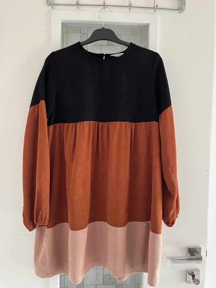 Salaş kesim, uzun kollu ve bisiklet yaka kadın tunik, kahverengi tonlarında pilili süet kumaştan, günlük kullanım için uygundur.