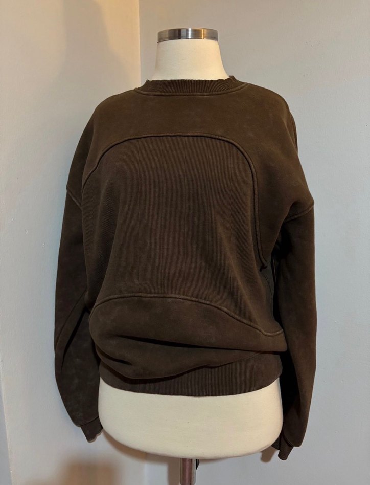 Kadınlar için kahverengi süet kumaştan, yuvarlak yakalı ve uzun kollu, salaş kesim sweatshirt. Günlük kullanım için sade, desensiz tasarım, athleisure ve streetwear tarzına uygun.