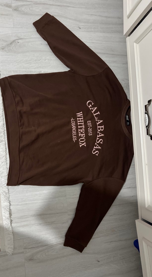 Kahverengi süet kumaştan, bol kesim ve uzun kollu bu sweatshirt, baskılı tasarımıyla günlük rahat şıklık sunar. Beyaz baskılı White Fox markalıdır.