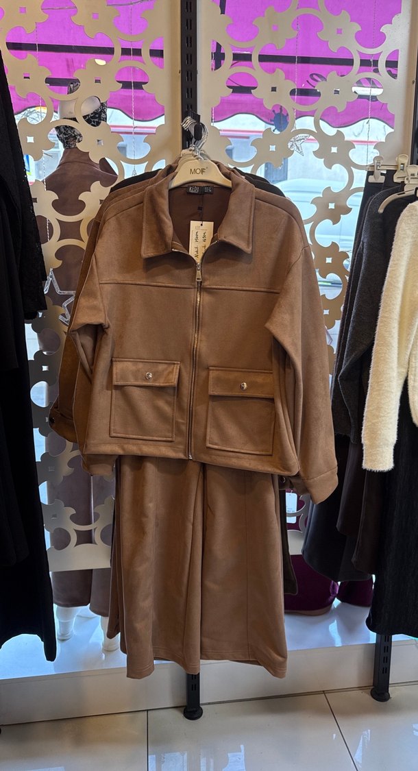 Kadın kahverengi süet takım, uzun kollu, kemerli ve kesik yaka detaylarıyla günlük sokak stili için uygundur.