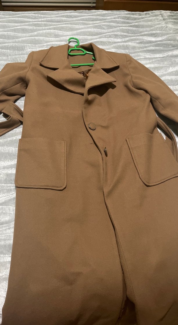 Kadınlar için parlak kahverengi süet kumaştan, kesik yaka ve uzun kollu, düğmeli, rahat kesim uzun kaban mango diye hatırlıyorum değilse bile çok kaliteli asla kabarma yapmaz taş gibidir kilo aldığım için giyemiyorum 38 beden 36 da olur bence