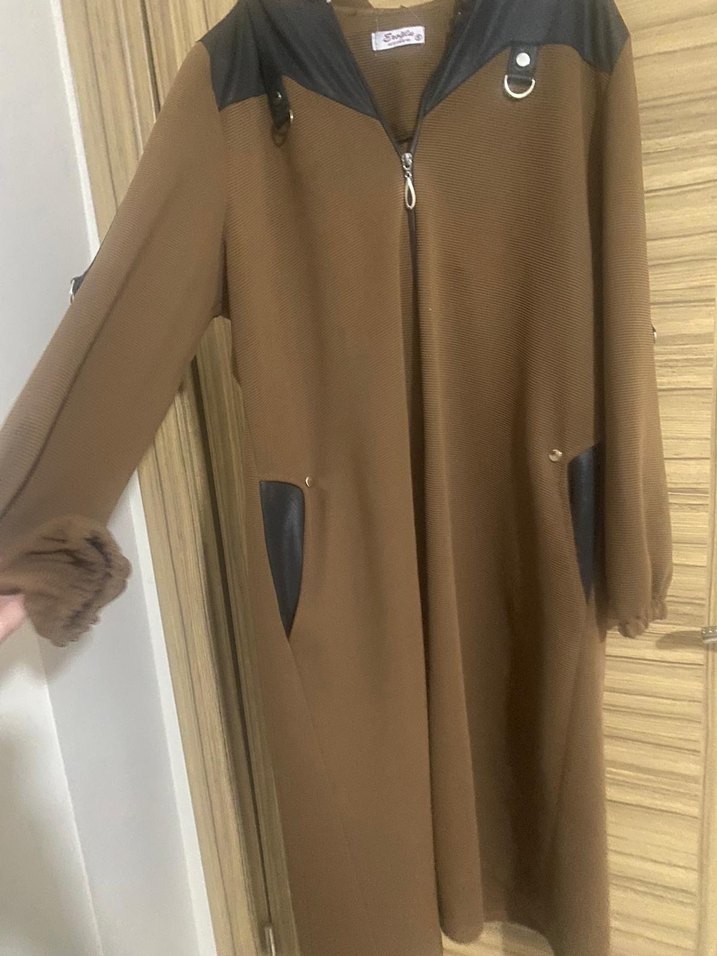 Kadın kahverengi süet uzun kaban, kruvaze yaka ve bol kesimlidir. Uzun kollu, fermuarlı ve omuz ile ceplerinde siyah detaylar bulunur, günlük rahat sokak stili için uygundur.