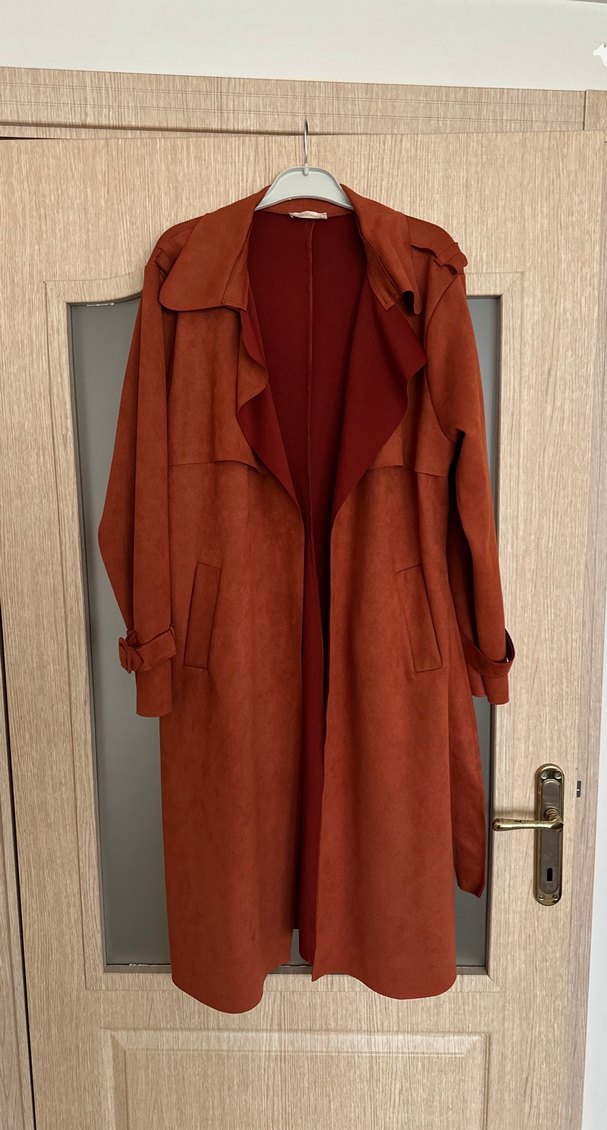 Kadın kahverengi süet uzun trençkot, kemerli ve notched yaka detaylı. Bol kesim, uzun kollu ve rahat sokak stili için uygun.