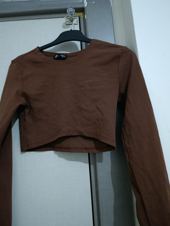 Uzun kollu, kruvaze yakalı kahverengi süet crop top, sade ve şık görünümüyle günlük rahat kombinlere uyum sağlar. Midi boyda, vücuda oturan kesim. yeri çok iyi