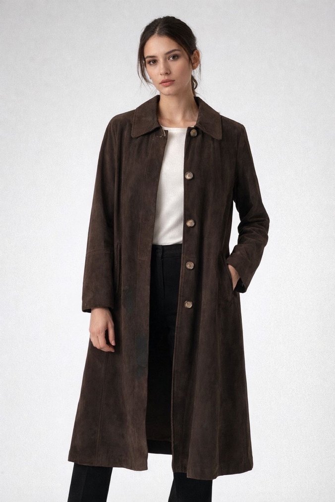 Kadın Kahverengi Süet Uzun Trençkot