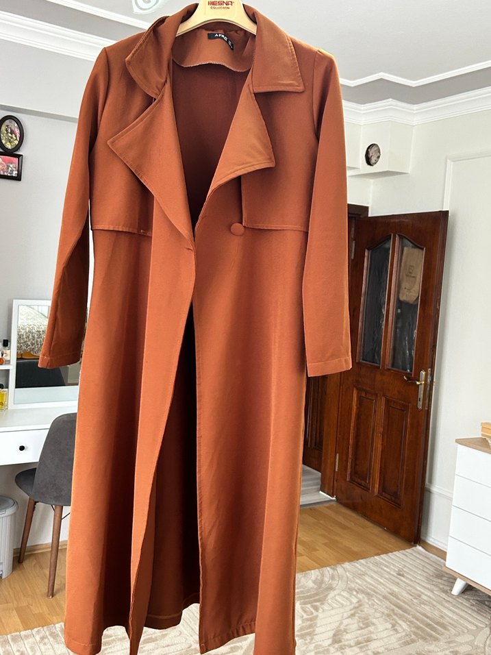 Kadın kahverengi süet uzun trençkot, yakalı ve düğmeli ön detaylıdır. Kemer yoktur o yüzden uyguna satıyorum