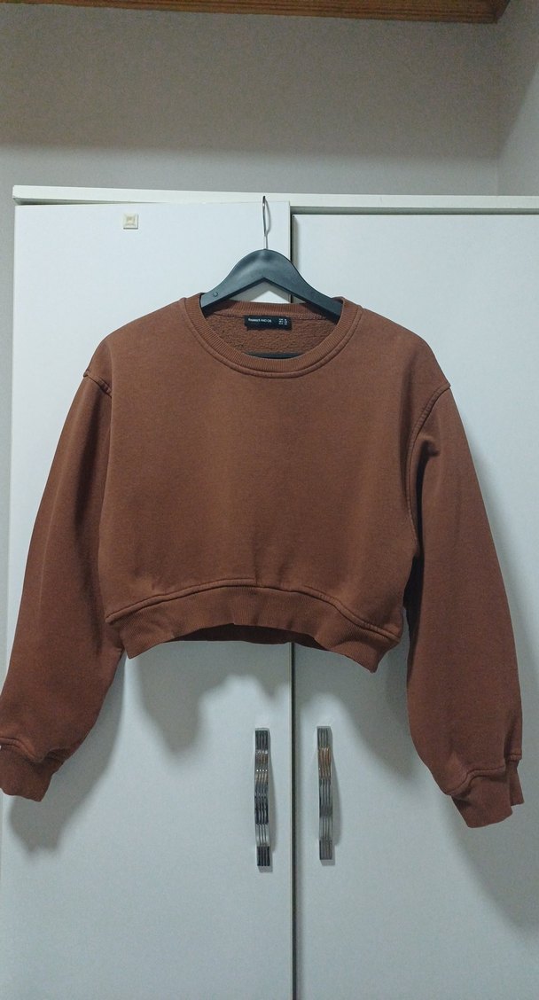 Kadınlar için yuvarlak yakalı, uzun kollu, bol kesim kahverengi sweatshirt.