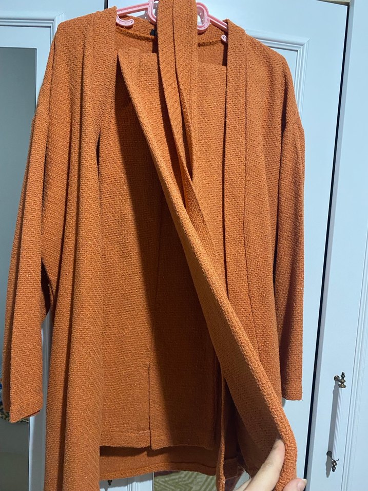 Kadın kaban, kahverengi, dökümlü ve yaka detaylıdır. Uzun kollu, rahat kesim ve uzun boyludur. Yumuşak sentetik kumaştan, gündelik kullanıma uygundur.