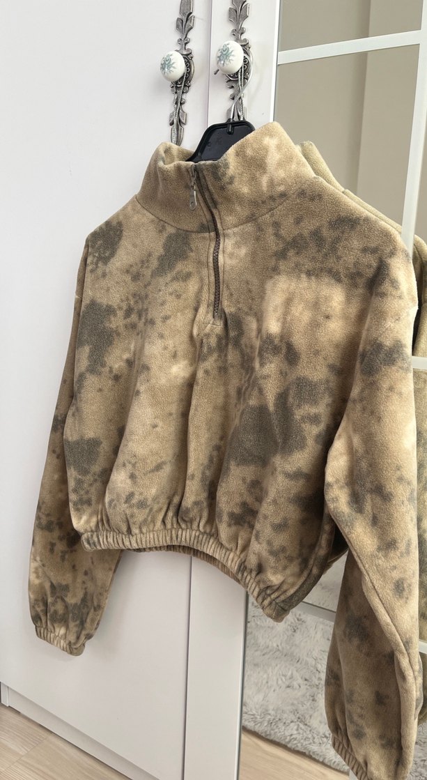 Yarım fermuarlı, yüksek yakalı, bol kesim bu kadın sweatshirtü kahverengi ve gri tie-dye desene sahip. Kürk detaylı, uzun kollu ve kısa boyda, rahat bir sokak stili sunar.
