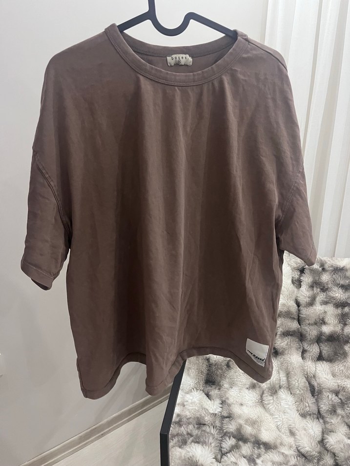 Kahverengi ,kısa kollu ve yuvarlak yakalı kadın tişörtü