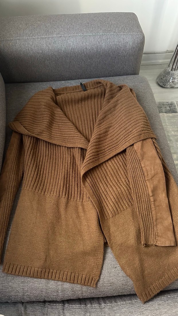 Kadın kahverengi triko hırka, notlu yaka ve uzun kollu. Yumuşak keten kumaştan, rahat kesim ve midi boyda, günlük kullanım için uygun.