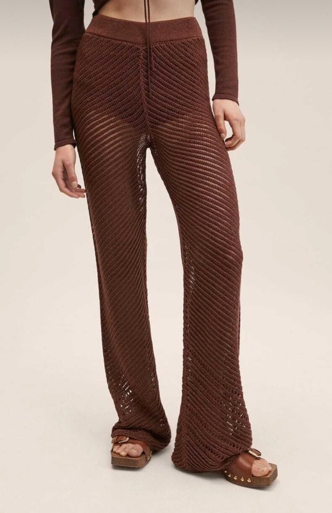 Kahverengi triko pantolon, rahat kalıp ve uzun boyda, yumuşak örgü kumaştan üretilmiştir. Günlük rahat tarz için uygundur.
