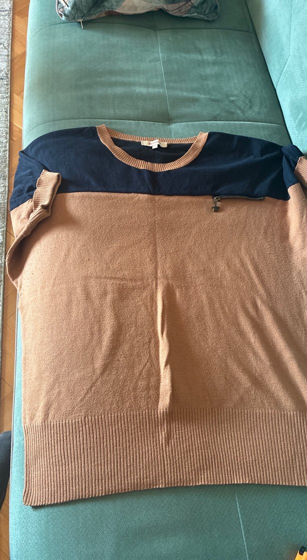 Kadınlar için yuvarlak yakalı, uzun kollu, kahverengi tonlarında ve salaş kesimde triko kazak. Normal boyda, örme dokuda, günlük kullanıma uygun.boy 68 iki koltuk arası 71 yarasa kol tarzlı omuzlar nubuk