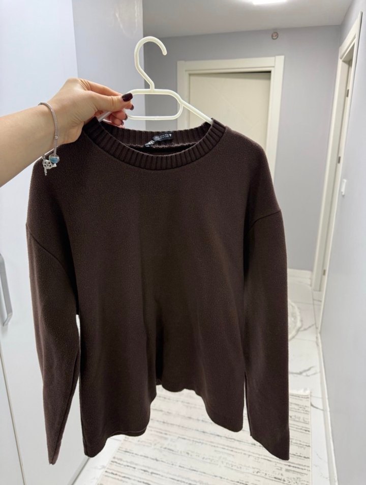 Kahverengi, yuvarlak yaka, uzun kollu, salaş kesim triko kazak, günlük rahat sokak stili için uygundur.