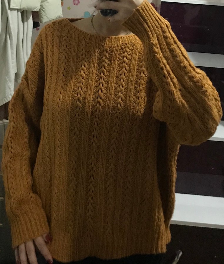 Kahverengi triko kazak, yuvarlak yaka ve uzun kollu, salaş kesim ve midi boyda, rahat ve şık bir görünüm sunar.