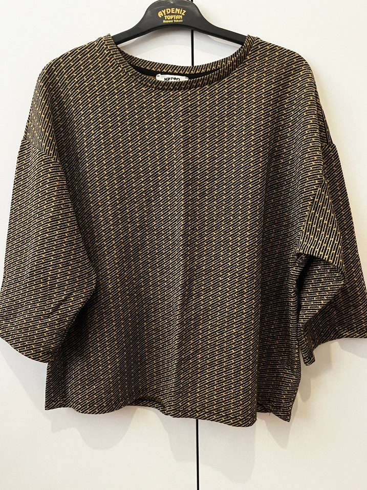 Kadın kahverengi triko, yuvarlak yaka ve uzun kollu, salaş kesimdir. Yumuşak sentetik kumaştan örülmüş, günlük rahat stil için uygundur.