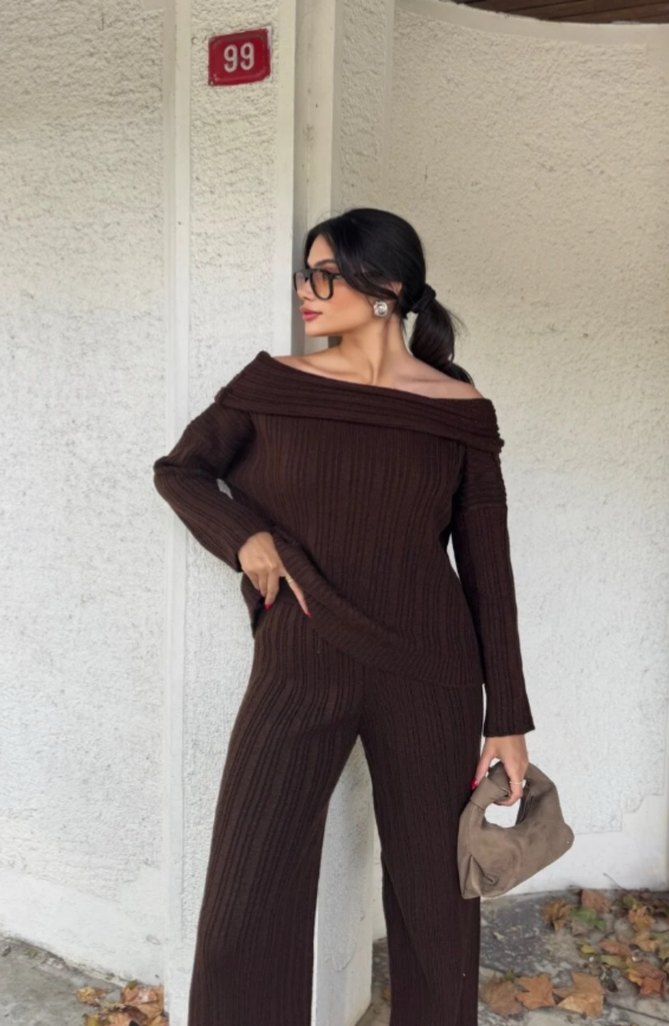 Kahverengi triko uzun elbise, kayık yaka ve uzun kollu, rahat ve şık sokak stili sunar. Regular fit ve uzun boydadır.
