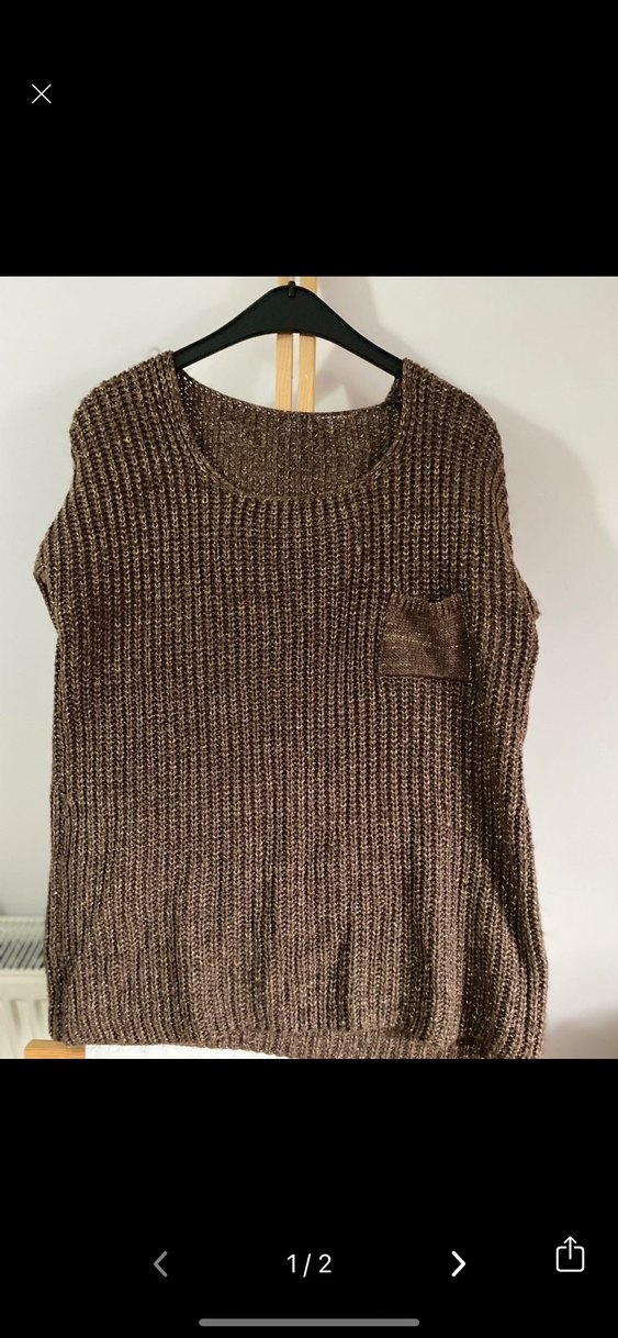Kahverengi,triko kazak. Salaş kesim, yuvarlak yakalı ve küçük cepli, rahat ve günlük kullanıma uygun. Xs S ve m beden uyumlu