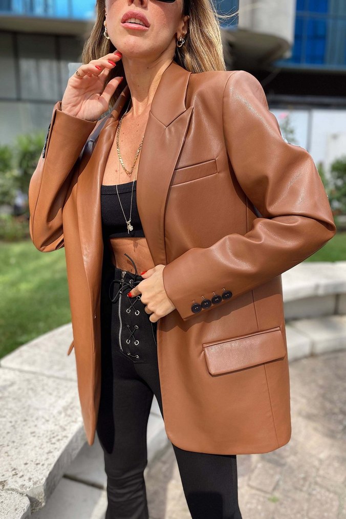 Kahverengi uzun deri ceket, yakalı ve kemerli tasarıma sahiptir. Parlak dokusu ve uzun kollu yapısıyla günlük kullanıma uygundur. uzunluk 72 cm iki koltuk altı arası 50 cm hiç kullanılmadı aldığım gibi duruyor kombin yapamadım