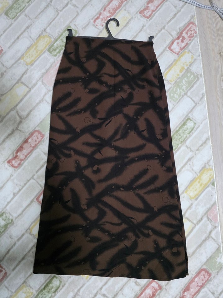 Koyu kahverengi desenli tasarıma sahiptir.Yandan az yırtmaca sahip, içi astarlıdır. Etiket üzerinde beden 40 yazmaktadır; ancak mezura ile yapılan ölçüme göre yarım bel ölçüsü 36 cm, etek boyu 96 cm’dir. Az kullanılmıştır. Tesettürlü bayanlar için daha idealdir