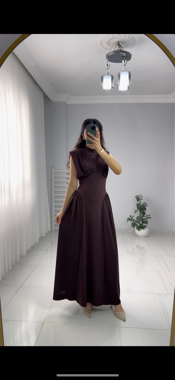 Kahverengi, drapeli ve yüksek yakalı, kolsuz uzun elbise. İpek gibi kumaştan, düzenli kesim ve minimalist, çağdaş tarzda, günlük kullanıma uygun.