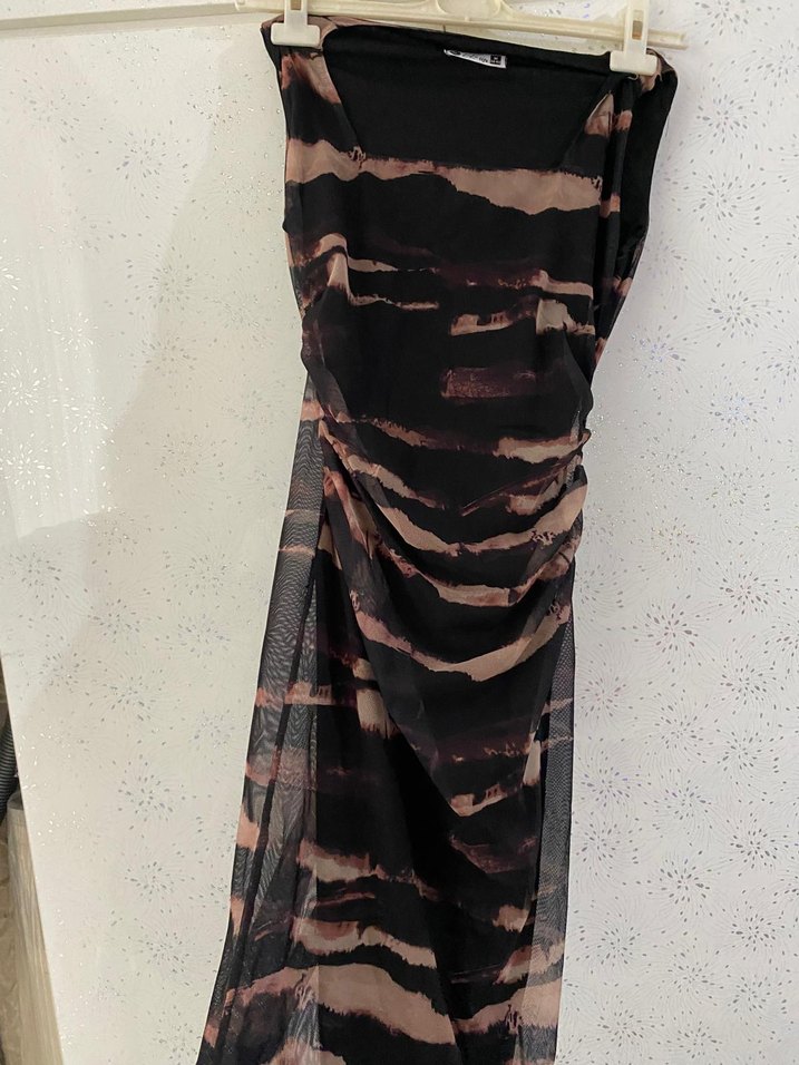 Kadınlar için uzun, vücuda oturan bu elbise, askısız yakaya ve ince askılara sahiptir. Sentetik kumaştan üretilmiş, koyu kahverengi bağlamalı desen ve drapeli detaylar içerir, açık hava etkinlikleri için uygundur.